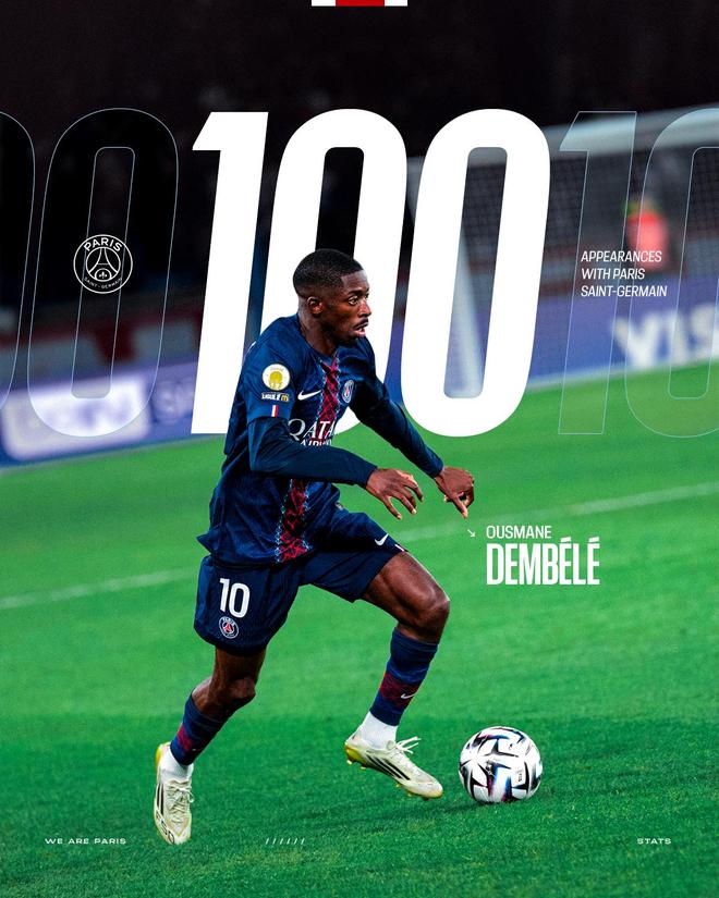 同时,本场比赛也是登贝莱代表巴黎圣日耳曼出战的第100场正式比赛。自2023年加盟巴黎圣日耳曼以来,登贝莱共代表球队各项赛事出战100场比赛,贡献44球32助攻,并随队夺得了1次欧冠冠军、2次法甲冠军、2次法国杯冠军以及2次法国超级杯冠军。